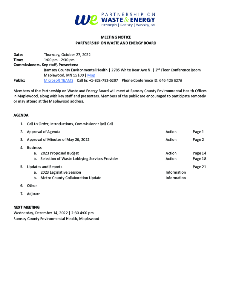 MEETING NOTICE PARTNERSHIP ON WASTE AND ENERGY BOARD Date: Thursday, October 27, 2022, Time: 1:00 pm 2:30 pm Commissioners, Key staff, Presenters: Ramsey County Environmental Health | 2785 White Bear