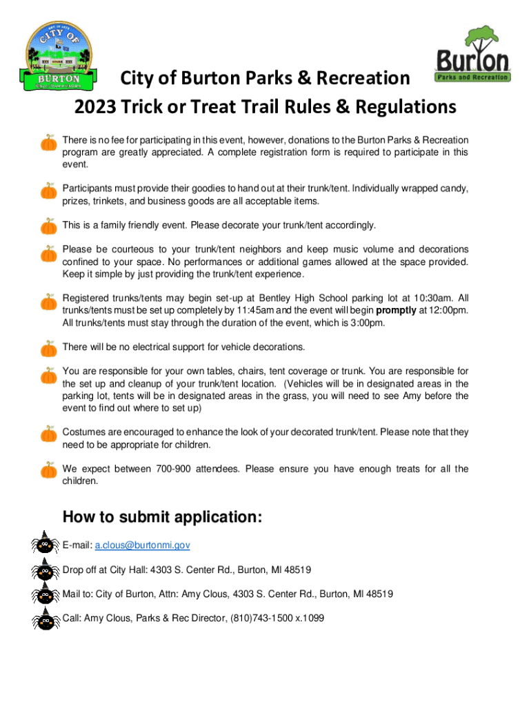 City of Burton Parks & Recreation 2023 Trick or Treat Trail Rules & Regulations There is no fee for participating in this event, however, donations to the Burton Parks & Recreation program are greatly