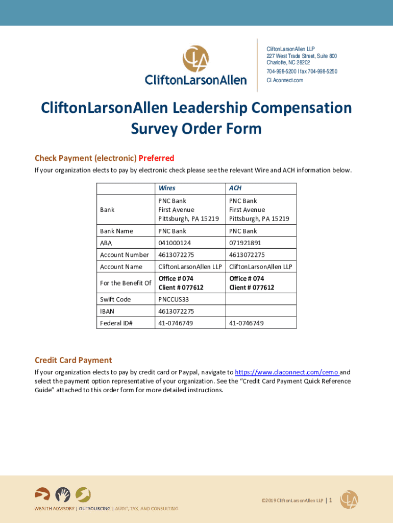 CliftonLarsonAllen LLP 227 West Trade Street, Suite 800 Charlotte, NC 28202 7049985200 | fax 7049985250 CLA connect.comCliftonLarsonAllenLeadershipCompensation SurveyOrderForm CheckPayment(electronic)Preferred