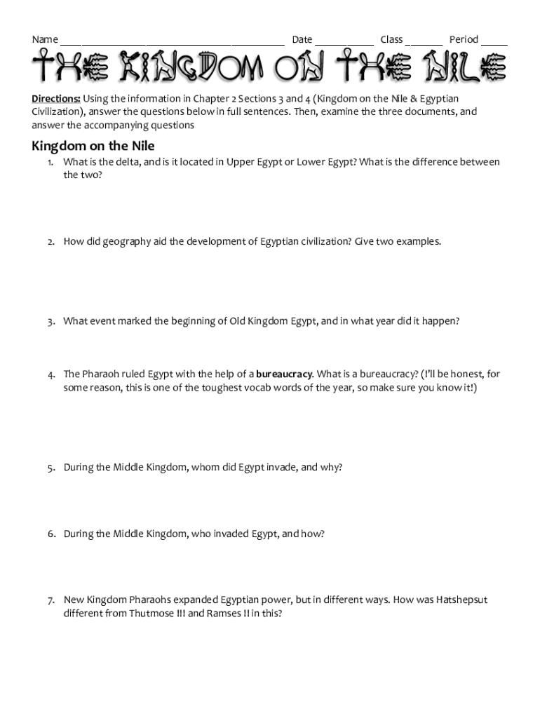 Name___Date___Class___Period___The Kingdom on the Nile Directions:UsingtheinformationinChapter2Sections3and4(KingdomontheNile&Egyptian Civilization), answerthequestionsbelowinfullsentences. Then,