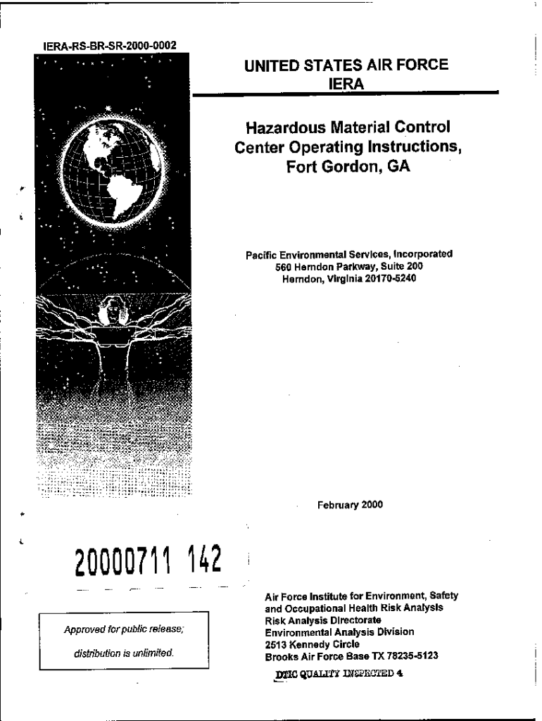 IERARSBRSR20000002UNITED STATES AIR FORCE ERA Hazardous Material Control Center Operating Instructions, Fort Gordon, GA Pacific Environmental Services, Incorporated 560 Herndon Parkway, Suite 200