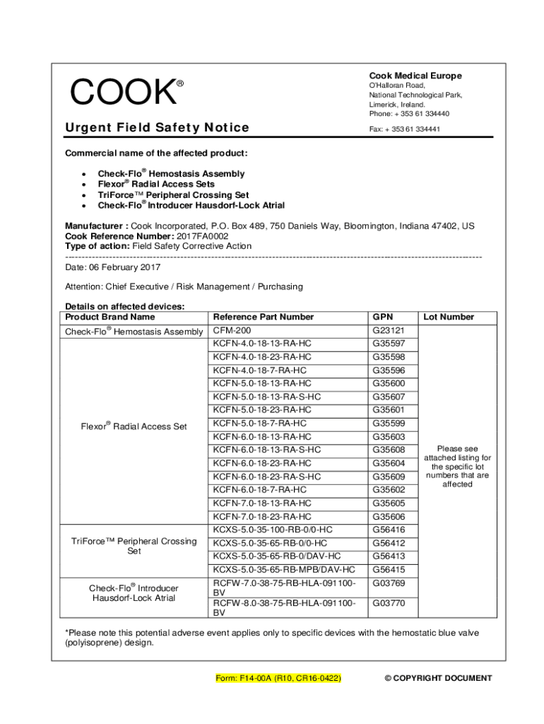 Phone: + 353 61 334440Urgent Field Safety Notice: + 353 61 334441Commercial name of the affected product: