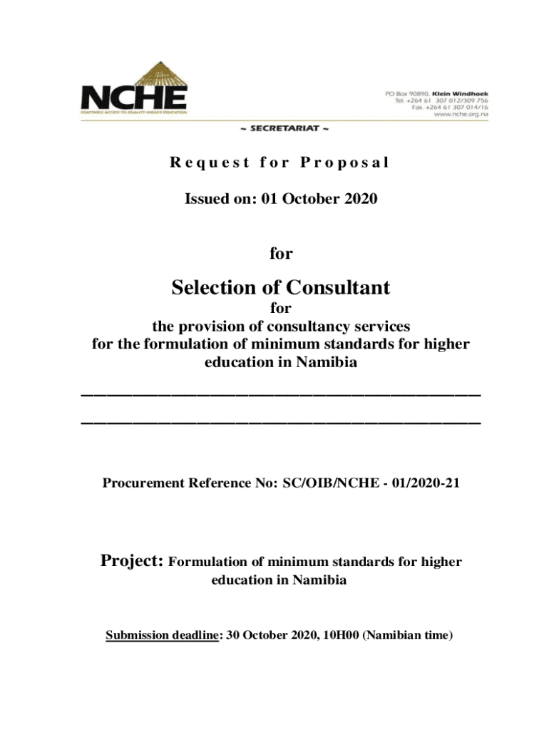 Request for Proposal Issued on: 01 October 2020forSelection of Consultant for the provision of consultancy services for the formulation of minimum standards for higher education in Namibia___ ___