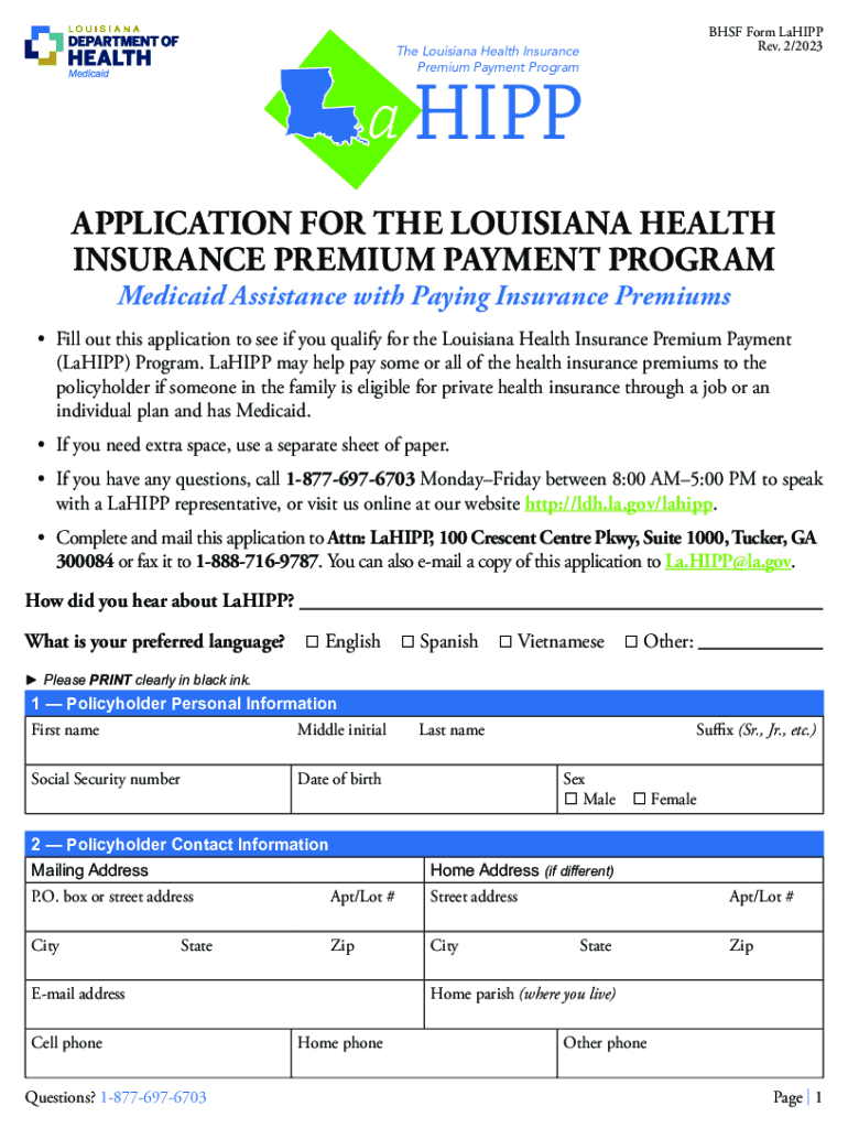 BHF Form Lapp Rev. 2/2023The Louisiana Health Insurance Premium Payment Program HIP APPLICATION FOR THE LOUISIANA HEALTH INSURANCE PREMIUM PAYMENT PROGRAM Medicaid Assistance with Paying Insurance