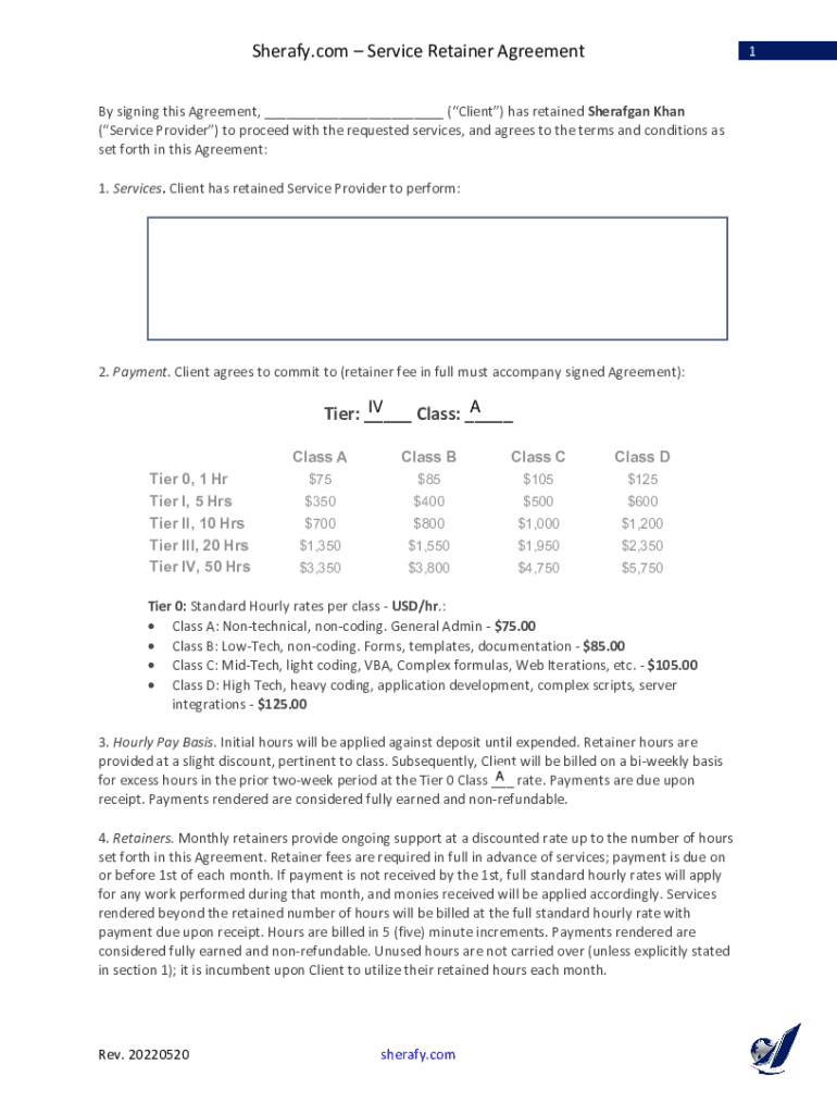 Sherafy.com Service Retainer Agreement1By signing this Agreement, ___ (Client) has retained Sheratan Khan (Service Provider) to proceed with the requested services, and agrees to the terms and conditions