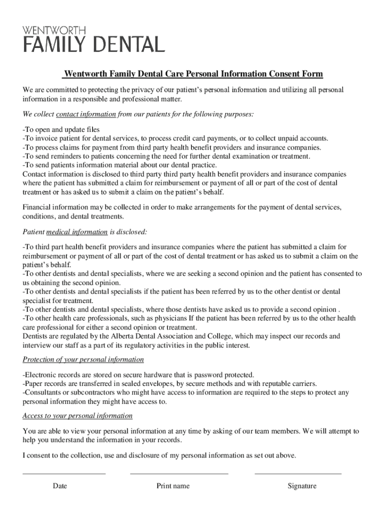 Wentworth Family Dental Care Personal Information Consent Form We are committed to protecting the privacy of our patients personal information and utilizing all personal information in a responsible