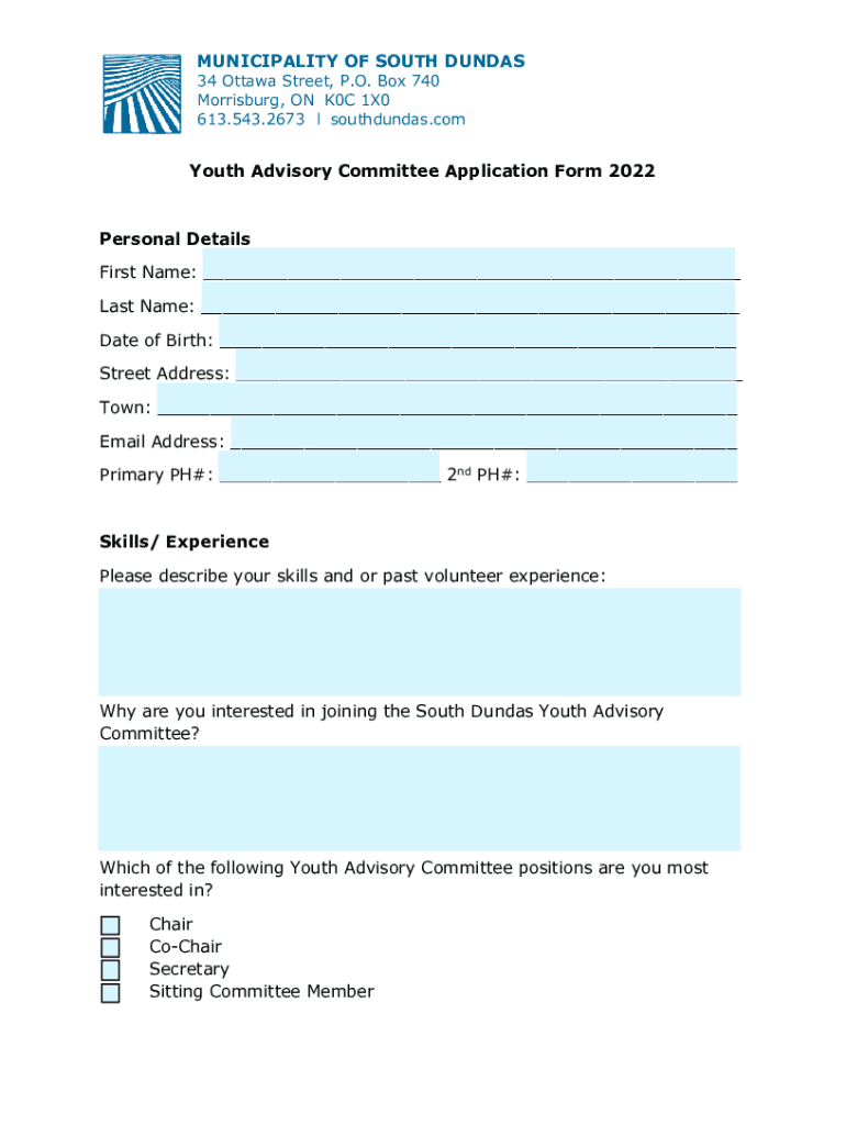 613.543.2673 l southdundas. Mouth Advisory Committee Application Form 2022Personal Details