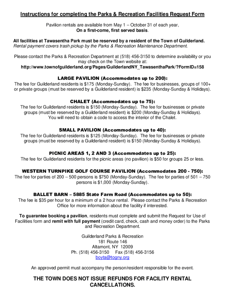 Instructions for completing the Parks & Recreation Facilities Request Form Pavilion rentals are available from May 1 October 31 of each year, On a first come, first served basis. All facilities at