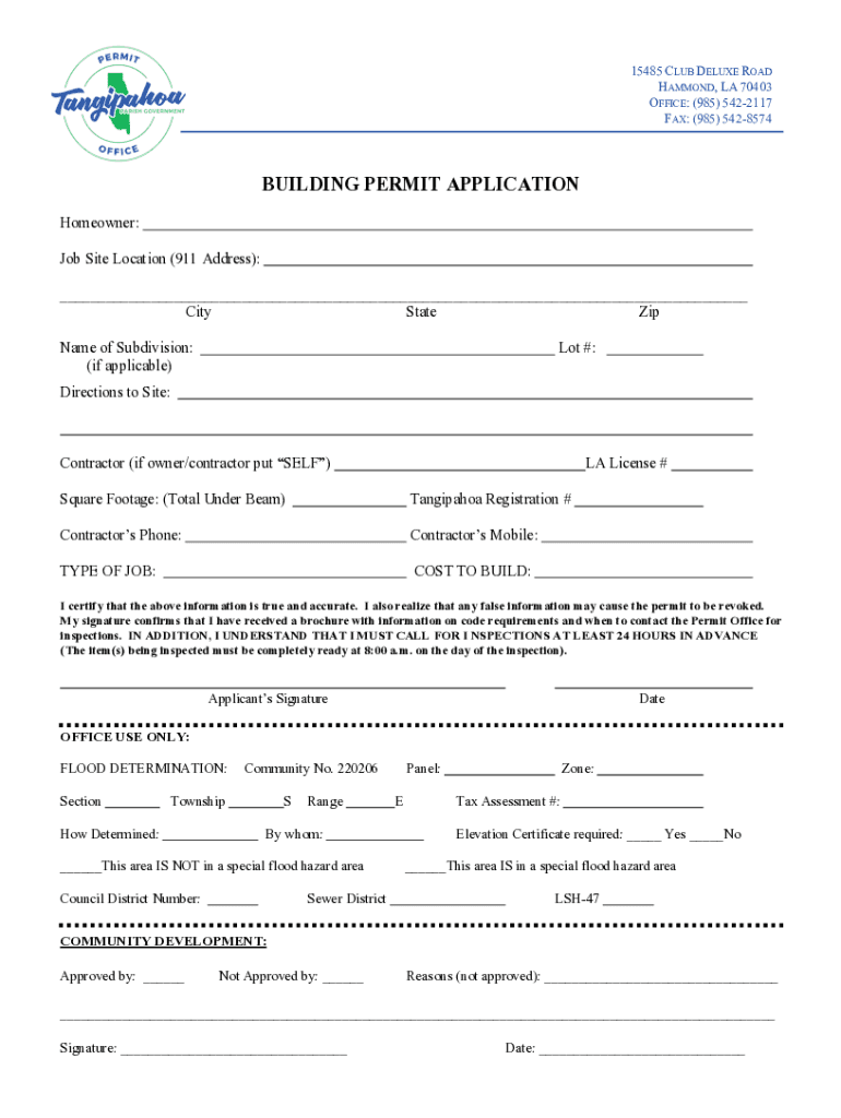 15485 CLUB DELUXE ROAD HAMMOND, LA 70403 OFFICE: (985) 5422117 FAX: (985) 5428574 BUILDING PERMIT APPLICATION Homeowner: Job Site Location (911 Address): ___ City State Zip Name of Subdivision: (if
