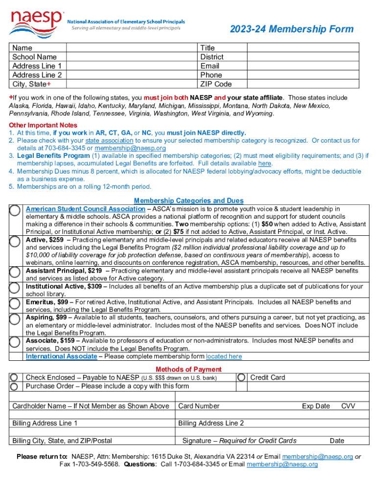 202324 Membership Form Name School Name Address Line 1 Address Line 2 City, State+Title District Email Phone ZIP Code+If you work in one of the following states, you must join both NAE SP and your