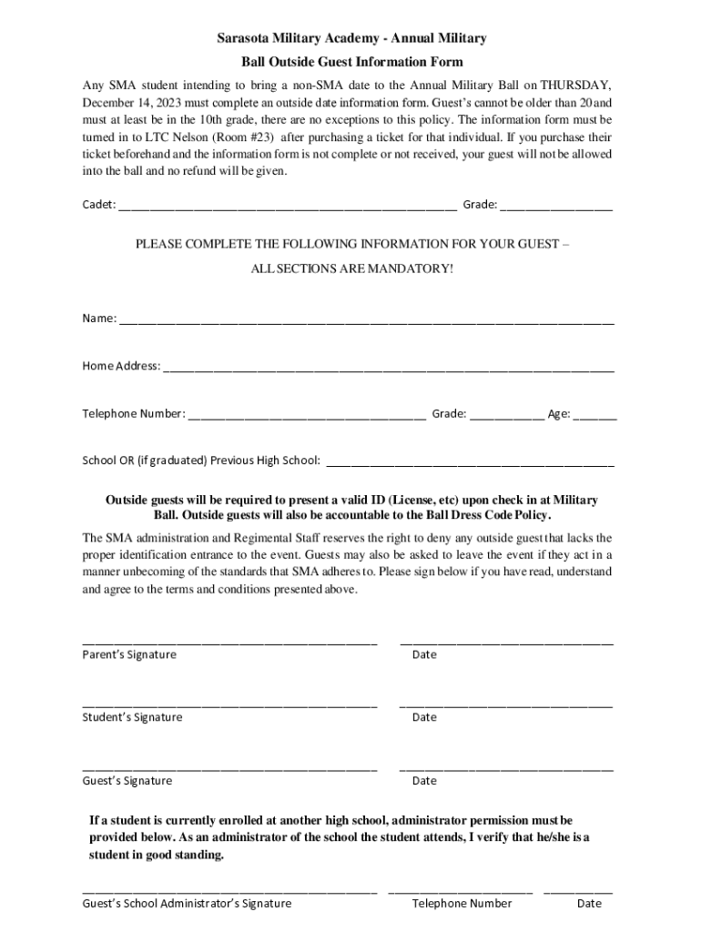 Sarasota Military Academy Annual Military Ball Outside Guest Information Form Any SMA student intending to bring a nonSMA date to the Annual Military Ball on THURSDAY, December 14, 2023, must complete