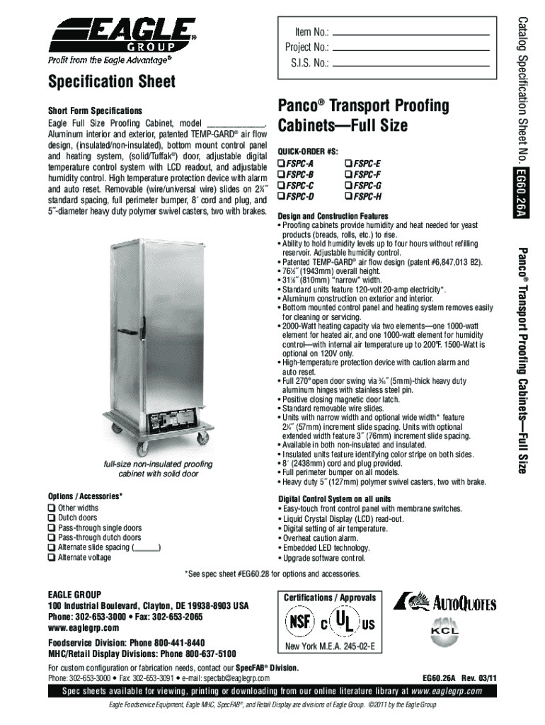 Specification Sheet Short Form Specifications Eagle Full Size Proofing Cabinet, model ___. Aluminum interior and exterior, patented TEMPLAR air flow design, (insulated/noninsulated), bottom mount