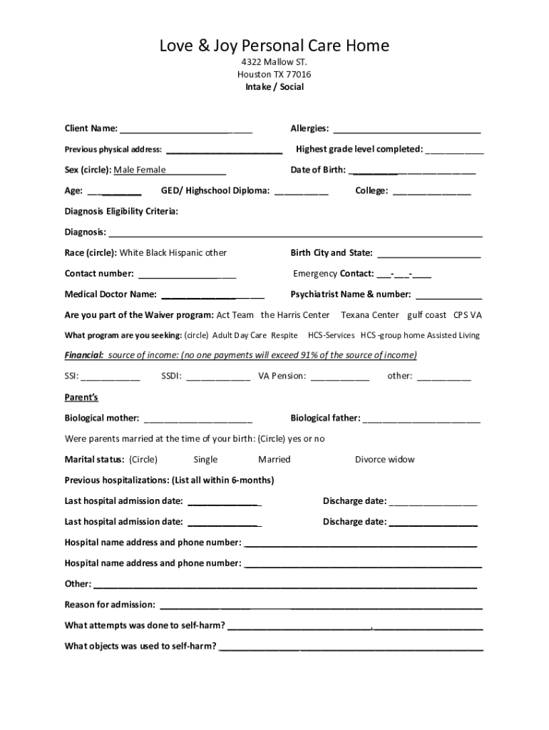 Love & Joy Personal Care Home 4322 Mallow ST. Houston TX 77016 Intake / SocialClient Name: ___Allergies: ___ The Highest grade level completed: ___Previous physical address: ___Sex (circle): Male