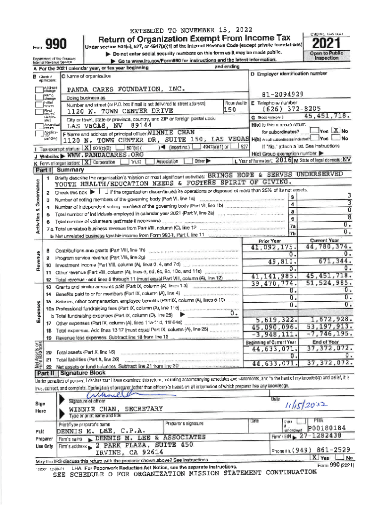 PANDA CARES FOUNDATION, INC. Part III Statement of Program Service Accomplishments812094929Form 990 (2021)1Page 2Check if Schedule O contains a response or note to any line in this Part III Briefly