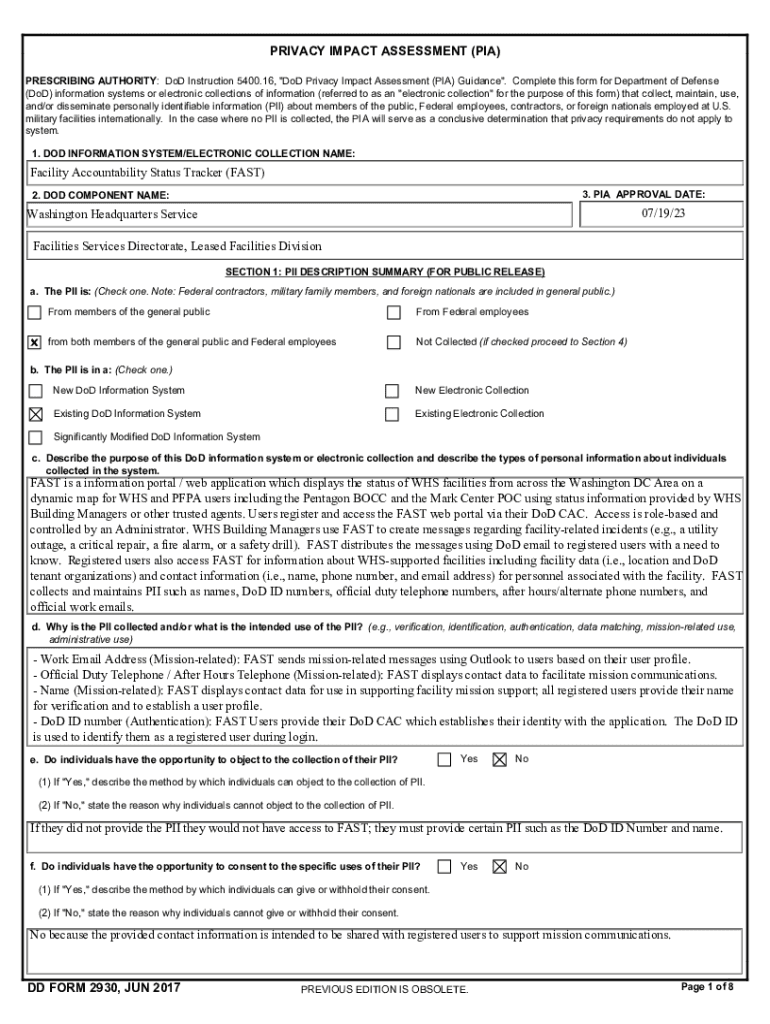 PRIVACY IMPACT ASSESSMENT (PIA) PRESCRIBING AUTHORITY: DoD Instruction 5400.16, \” DoD Privacy Impact Assessment (PIA) Guidance\”. Complete this form for Department of Defense (DoD) information