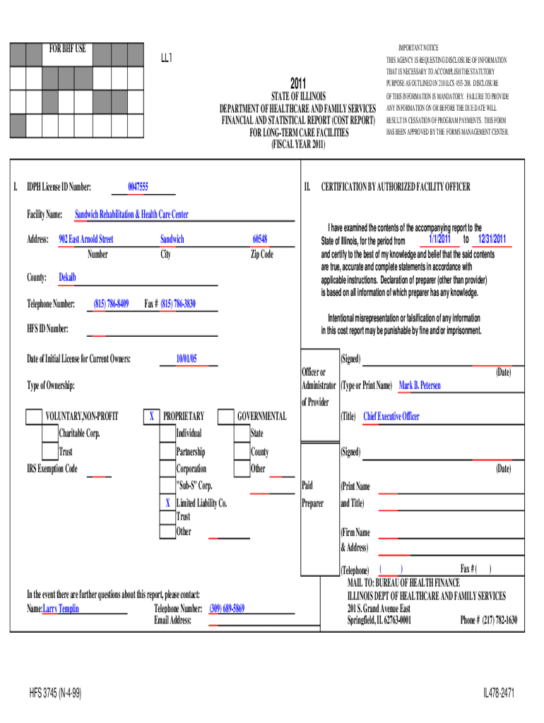 FOR BHF USELL1 2011 STATE OF ILLINOIS DEPARTMENT OF HEALTHCARE AND FAMILY SERVICES FINANCIAL AND STATISTICAL REPORT (COST REPORT) FOR LONGER CARE FACILITIES (FISCAL YEAR 2011)I.DPH License ID Number: