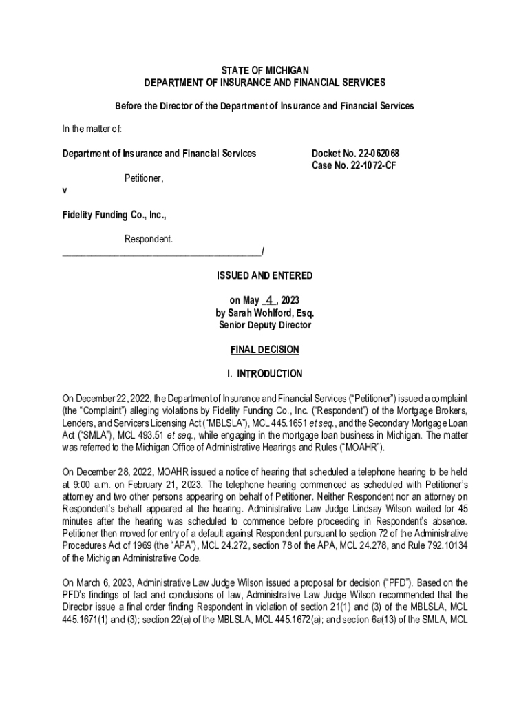 STATE OF MICHIGAN DEPARTMENT OF INSURANCE AND FINANCIAL SERVICES Before the Director of the Department of Insurance and Financial Services In the matter of: Department of Insurance and Financial ServicesDocket