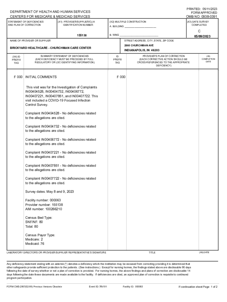 PRINTED: 05/11/2023 FORM APPROVEDDEPARTMENT OF HEALTH AND HUMAN SERVICES CENTERS FOR MEDICARE & MEDICAID SERVICES STATEMENT OF DEFICIENCIES AND PLAN OF CORRECTION(X1) PROVIDER/SUPPLIER/CIA IDENTIFICATION