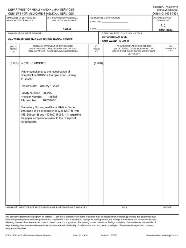 PRINTED: 02/02/2023 FORM APPROVEDDEPARTMENT OF HEALTH AND HUMAN SERVICES CENTERS FOR MEDICARE & MEDICAID SERVICES STATEMENT OF DEFICIENCIES AND PLAN OF CORRECTION(X1) PROVIDER/SUPPLIER/CIA IDENTIFICATION