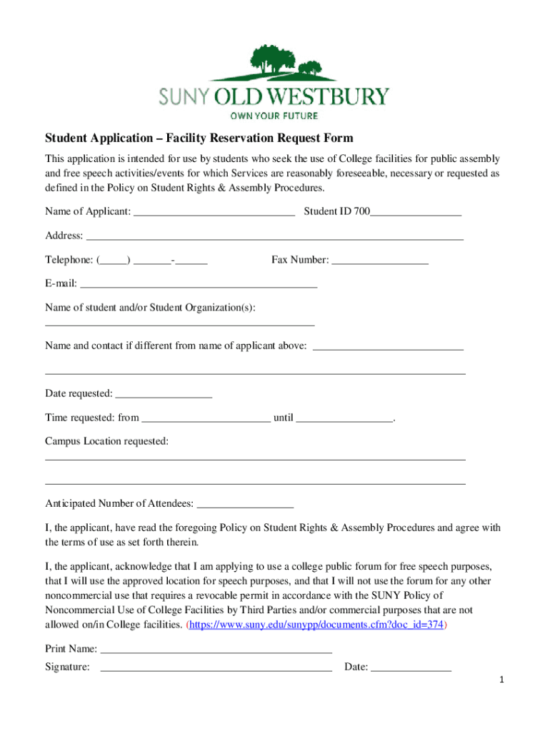 Student Application Facility Reservation Request Form This application is intended for use by students who seek the use of College facilities for public assembly and free speech activities/events