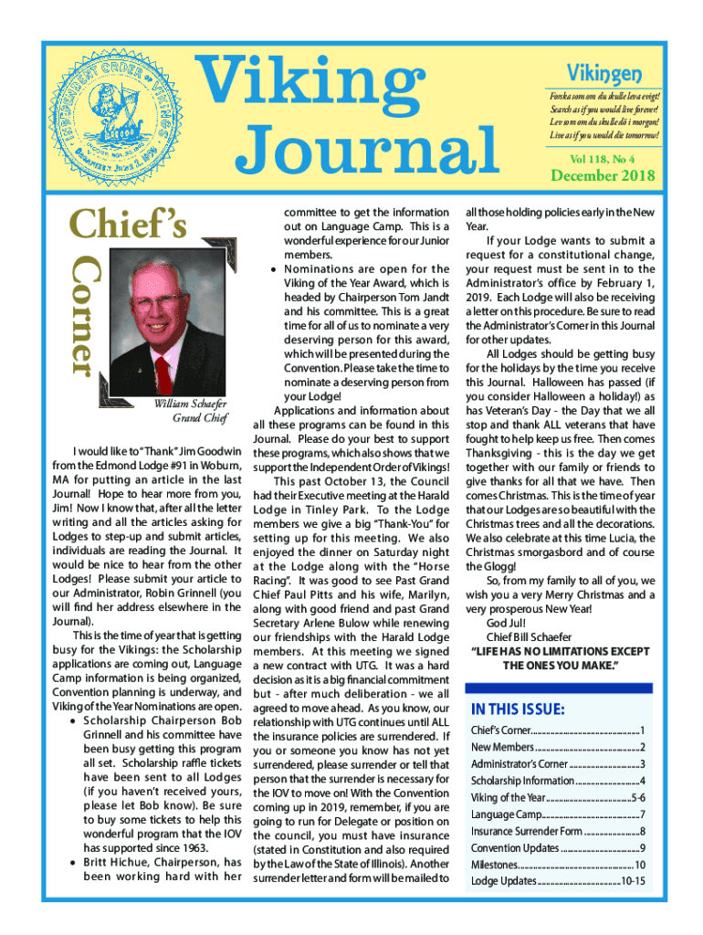 Viking Journal Chief s Corner William Schaefer Grand Chief would like to Thank Jim Goodwin from the Edmond Lodge #91 in Woburn, MA for putting an article in the last Journal! Hope to hear more from