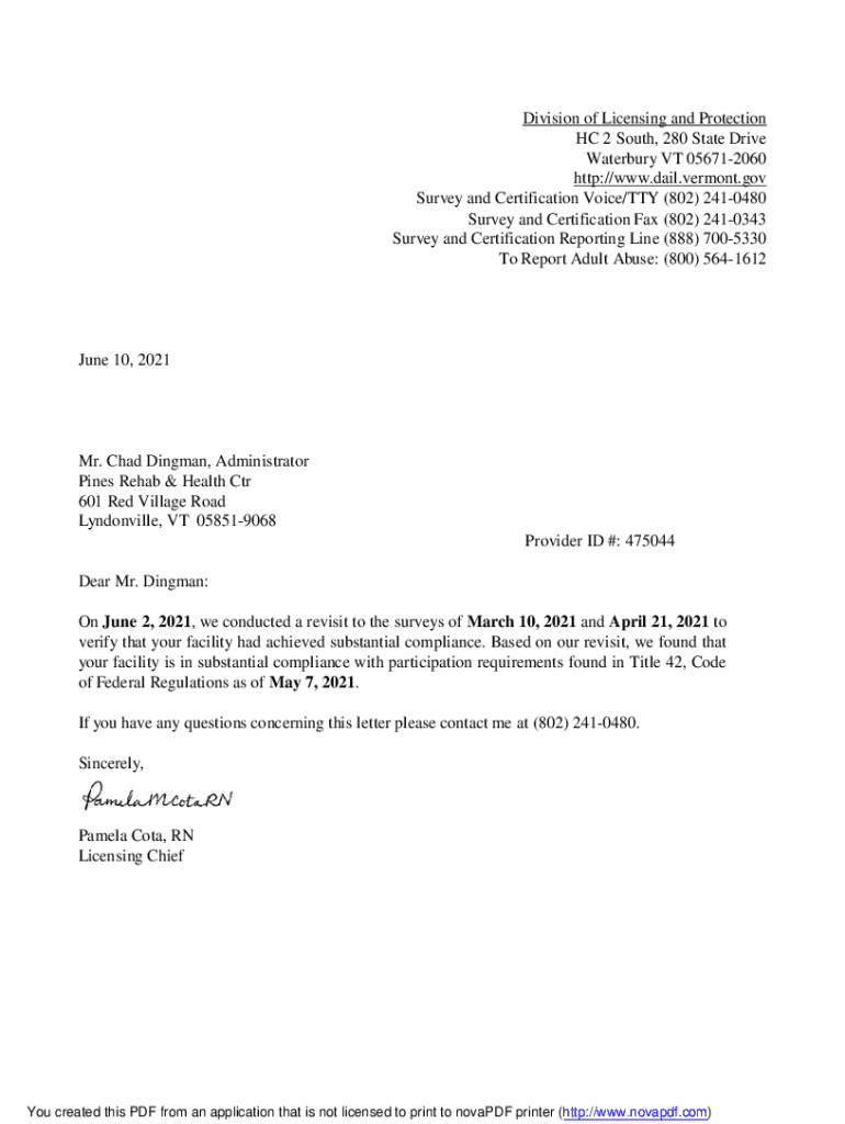 Division of Licensing and Protection HC 2 South, 280 State Drive Waterbury VT 056712060 http://www.dail.vermont.gov Survey and Certification Voice/TTY (802) 2410480 Survey and Certification Fax (802)