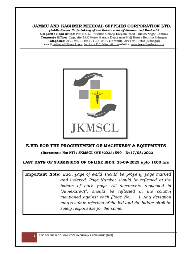 JAMMY AND KASHMIR MEDICAL SUPPLIES CORPORATION LTD. (Public Sector Undertaking of the Government of Jammy and Kashmir) Corporate Head Office: Plot No. 58, Friends Colony Sat yam Road Tribute Nagar