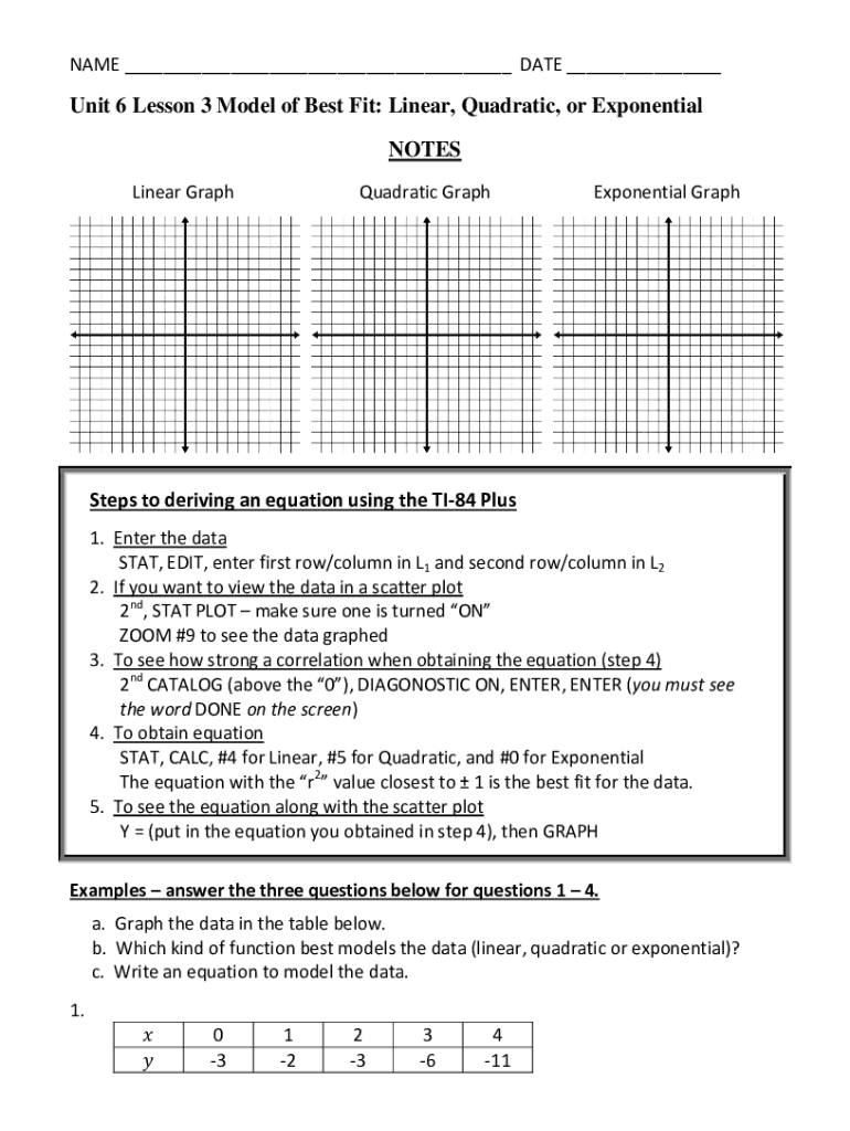 NAME ___ DATE ___Unit 6 Lesson 3 Model of Best Fit: Linear, Quadratic, or Exponential NOTES Linear GraphQuadratic GraphExponential Grafters to deriving an equation using the TI84 Plus 1. Enter the