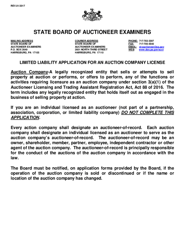 REV.01/2017STATE BOARD OF AUCTIONEER EXAMINERS MAILING ADDRESS STATE BOARD OF AUCTIONEER EXAMINERS P.O. BOX 2649 HARRISBURG, PA 17105COURIER ADDRESS STATE BOARD OF AUCTIONEER EXAMINERS 2601 NORTH
