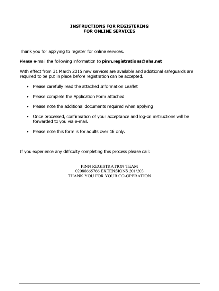 INSTRUCTIONS FOR REGISTERING FOR ONLINE SERVICESThank you for applying to register for online services. Please email the following information to pinn.registrations@nhs.net With effect from 31 March