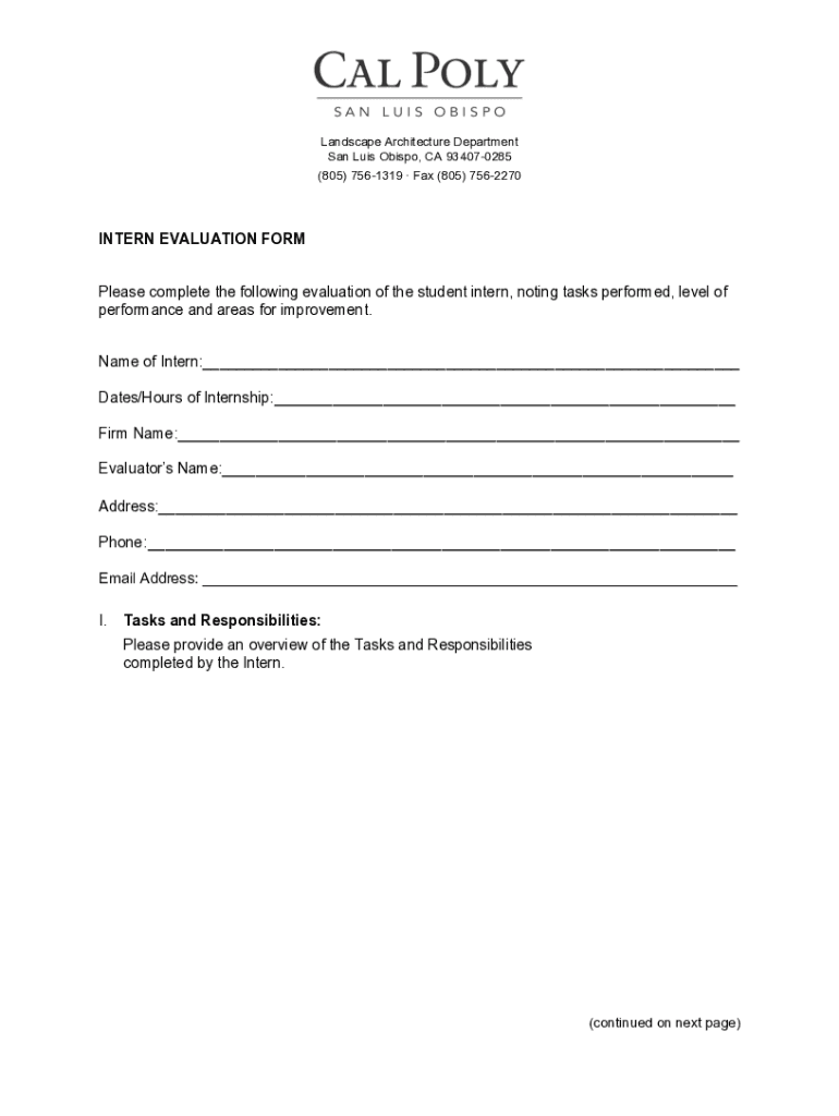 Landscape Architecture Department San Luis Obispo, CA 934070285 (805) 7561319 Fax (805) 7562270INTERN EVALUATION FORM Please complete the following evaluation of the student intern, noting tasks performed,