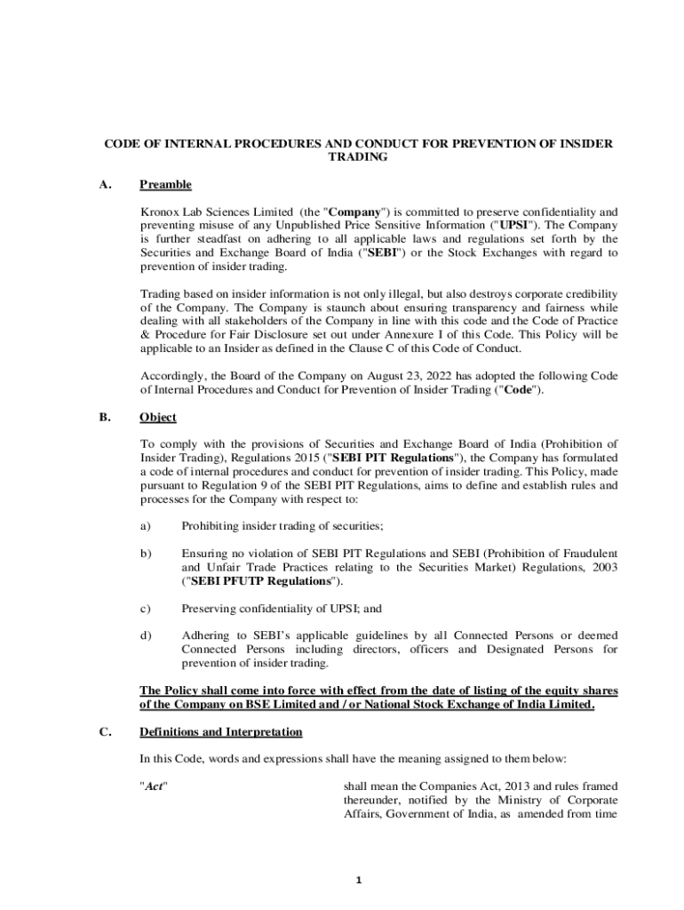 CODE OF INTERNAL PROCEDURES AND CONDUCT FOR PREVENTION OF INSIDER TRADING A. Preamble Kronor Lab Sciences Limited (the \” Company\”) is committed to preserve confidentiality and preventing misuse