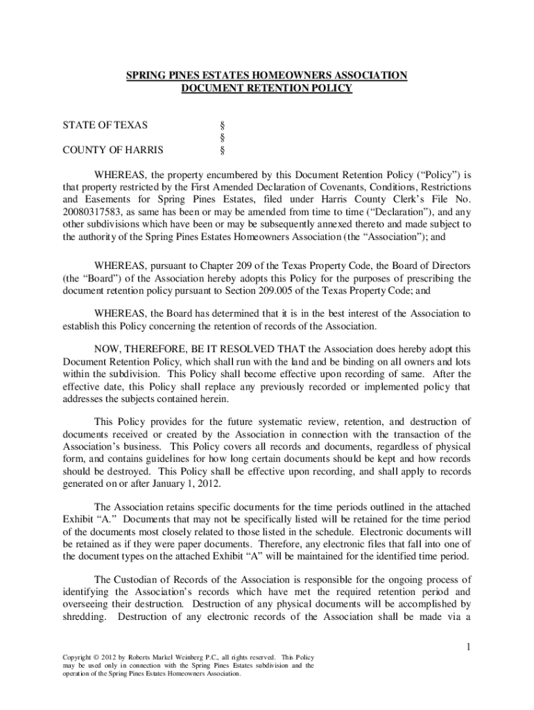 SPRING PINES ESTATES HOMEOWNERS ASSOCIATION DOCUMENT RETENTION POLICYSTATE OF TEXAS COUNTY OF HARRIS WHEREAS, the property encumbered by this Document Retention Policy (Policy) is that property restricted