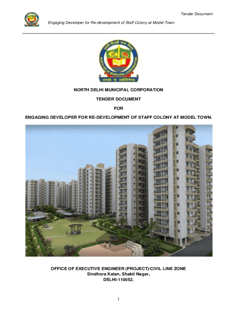 Tender Document Engaging Developer for Redevelopment of Staff Colony at Model Town. NORTH DELHI MUNICIPAL CORPORATION TENDER DOCUMENT FOR ENGAGING DEVELOPER FOR REDEVELOPMENT OF STAFF COLONY AT MODEL