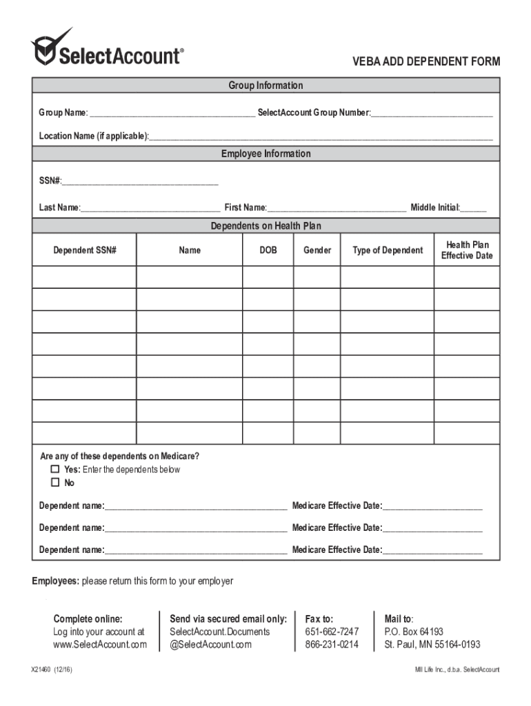 VEGA ADD DEPENDENT FORM Group Information Group Name: ___ SelectAccount Group Number:___ Location Name (if applicable):___Employee Information SSN#:___ Last Name:___ First Name:___ Middle Initial:___Dependents