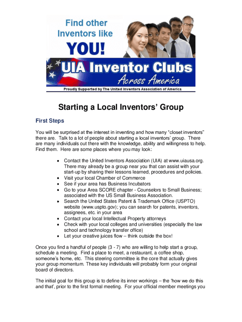 Starting a Local Inventors Group First Steps You will be surprised at the interest in inventing and how many closet inventors there are. Talk to a lot of people about starting a local inventors group.
