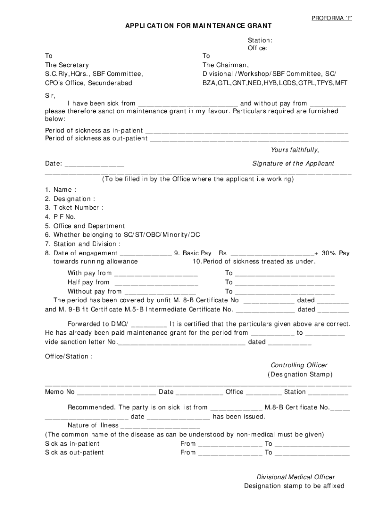 APPLICATION FOR MAINTENANCE GRANTPROFORMA Station: Office: To The Secretary S.C. Rly, HQrs., SBF Committee, CMOS Office, SecunderabadTo The Chairman, Divisional /Workshop/SBF Committee, SC/ BZA, GTL,