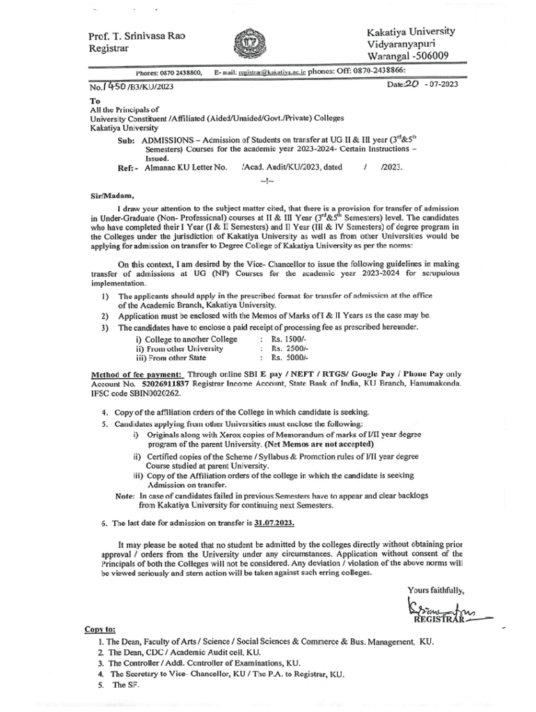 WARANGAL506 009 TELANGANAAPPLICATIONFORM FOR TRANSFER OF ADMISSIONINTO UG NONPROFESSIONAL COURSES FOR THE ACADEMIC YEAR 20232024