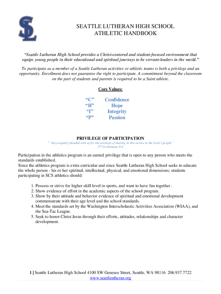 SEATTLE LUTHERAN HIGH SCHOOL ATHLETIC HANDBOOK Seattle Lutheran High School provides a Christ centered and student focused environment that equips young people in their educational and spiritual journeys