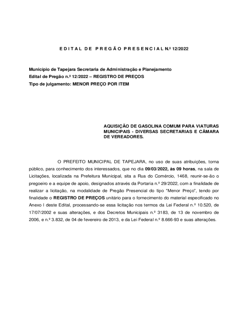 E D I T A L D E P R E G O P R E S E N C I A L N. 12/2022Municpio de Taper Secretariat de Administrao e Planejamento