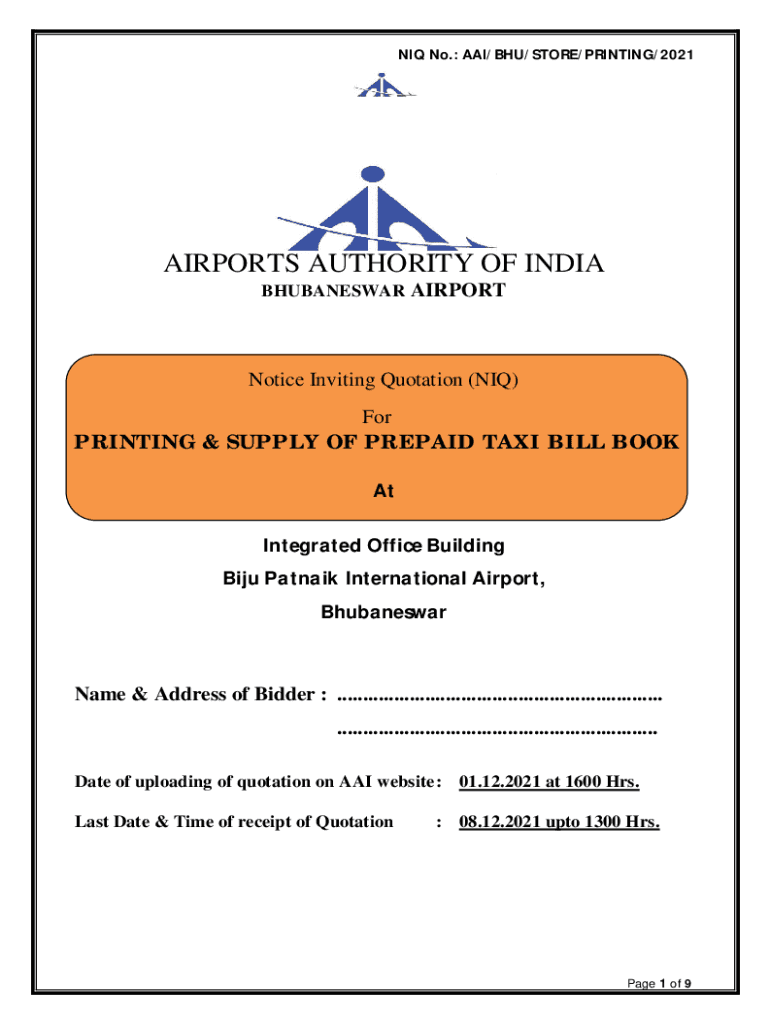 IQ No.: AAI/BHU/STORE/PRINTING/2021AIRPORTS AUTHORITY OF INDIA BHUBANESWAR AIRPORTNotice Inviting Quotation (IQ) For PRINTING & SUPPLY OF PREPAID TAXI BILL BOOK At Integrated Office Building Bijou