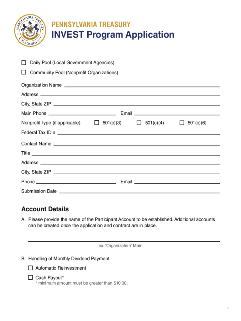 PENNSYLVANIA TREASURYINVEST Program Application Daily Pool (Local Government Agencies) Community Pool (Nonprofit Organizations) Organization Name Address City, State ZIP Main Phonemic Nonprofit Type