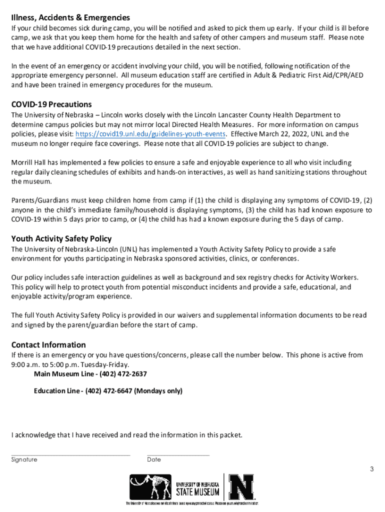 Camp Archie Summer Day Camps 2023Dear Parents/Guardians, Thank you for registering your child for the University of Nebraska State Museum Morrill Hall Summer Day Camp program. Please read the following