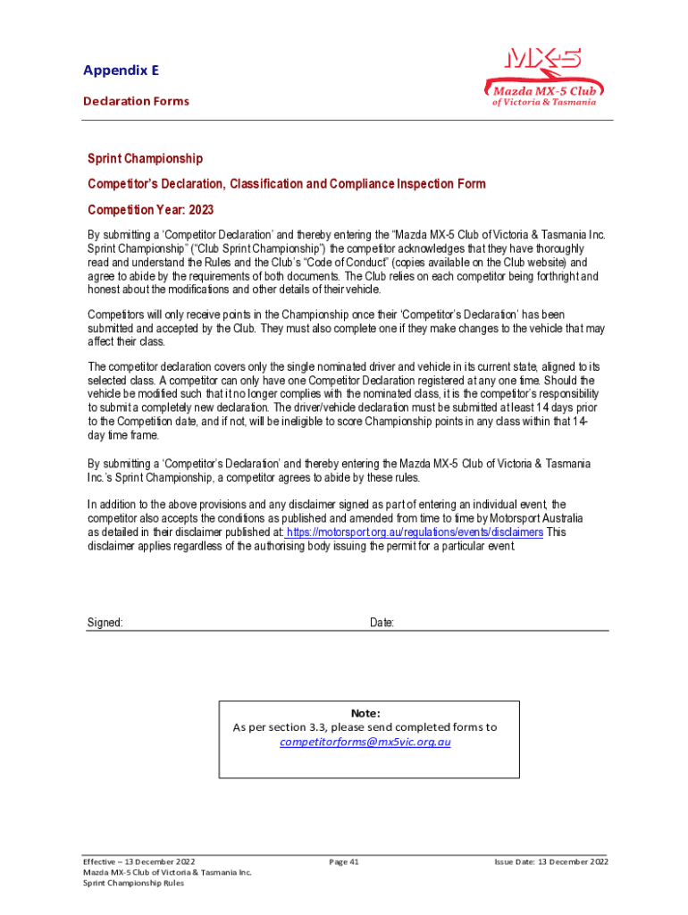 Appendix E Declaration Forms Sprint Championship Competitors Declaration, Classification and Compliance Inspection Form Competition Year: 2023 By submitting a Competitor Declaration and thereby entering