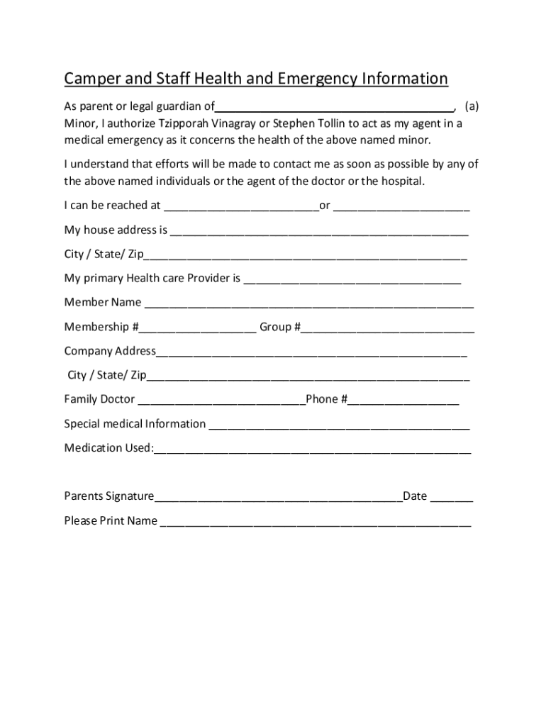 Camper and Staff Health and Emergency Information As parent or legal guardian of ___, (a) Minor, I authorize Tzipporah or Stephen Tomlin to act as my agent in a medical emergency as it concerns the