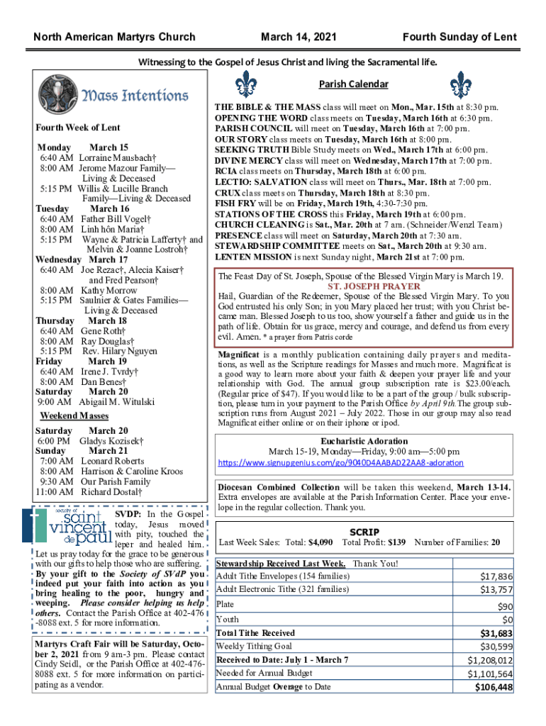 North American Martyrs Church March 14, 2021Fourth Sunday of LentWitnessing to the Gospel of Jesus Christ and living the Sacramental life. Parish Calendar Fourth Week of Lent Monday, March 15 6:40