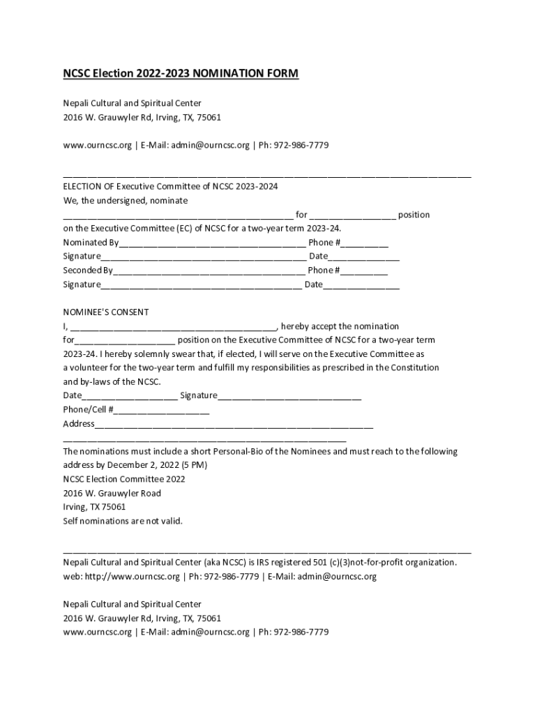 Get the free Nomination formNepali Cultural and Spiritual Center (NCSC)