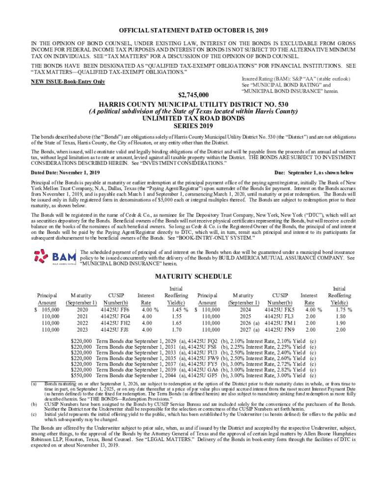 OFFICIAL STATEMENT DATED OCTOBER 15, 2019, IN THE OPINION OF BOND COUNSEL, UNDER EXISTING LAW, INTEREST ON THE BONDS IS EXCLUDABLE FROM GROSS INCOME FOR FEDERAL INCOME TAX PURPOSES AND INTEREST ON
