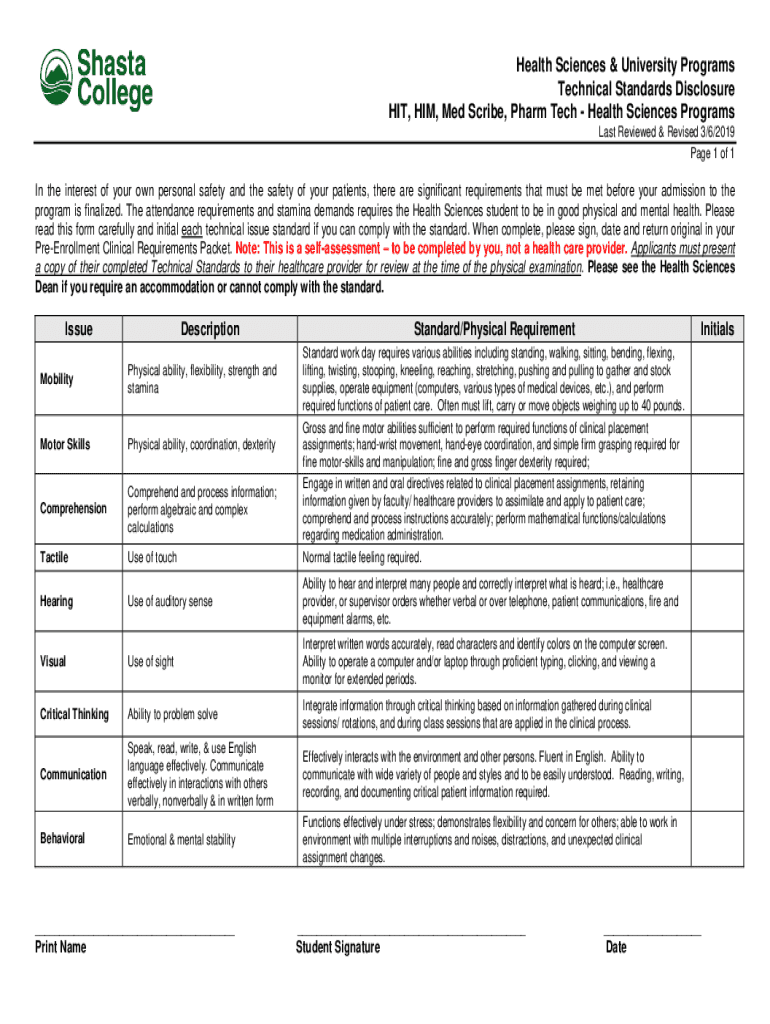 Health Sciences & University Programs Technical Standards Disclosure HIT, HIM, Med Scribe, Harm Tech Health Sciences Programs Last Reviewed & Revised 3/6/2019-Page 1 of 1In the interest of your own