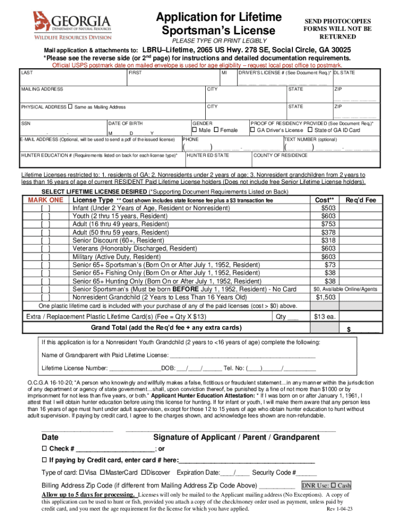 Application for Lifetime Sportsman License SEND PHOTOCOPIES FORMS WILL NOT BE RETURNEDPLEASE TYPE OR PRINT LEGIBLY Mail application & attachments to:LBRULifetime, 2065 US Hwy. 278 SE, Social Circle,
